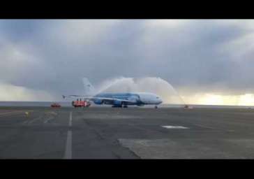Water salute de l'A380 sur la piste de l'aéroport de La Réunion Roland Garros
